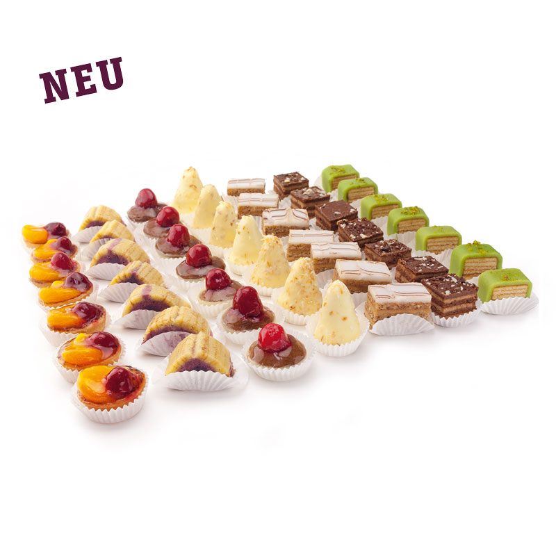 je 7 Stück: Mürbteigschüsserl, Heidelbeerterrine, Schokoschüsserl, Kokosspitz, Esterhazyschnitte, Baumkuchenschnitte und 8 Stück: Schoko-Nougatschnitte